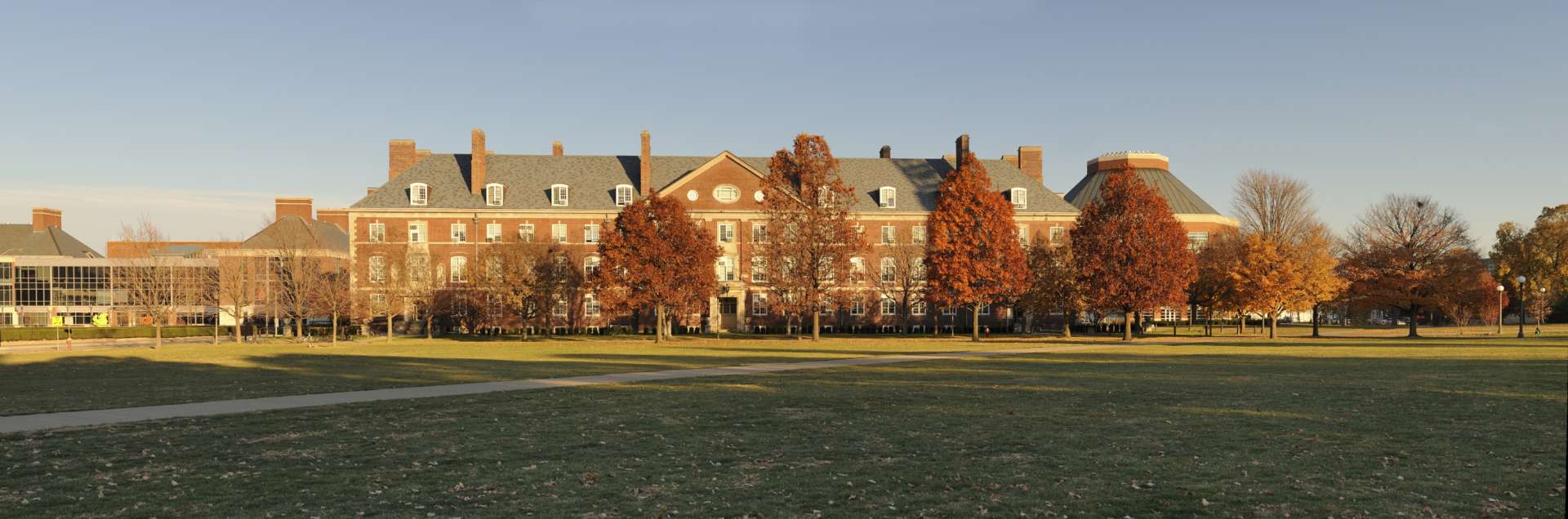 Mumford Hall at 1301 W. Gregory Drive on the South Quad of the University of Illinois in Urbana, Illinois on November 10, 2010. This panoramic photograph consists of six exposures stitched together using PTGui software.